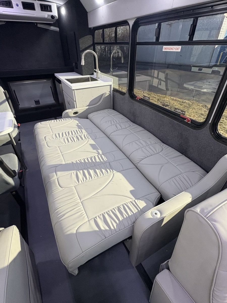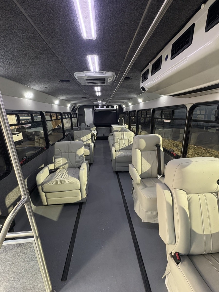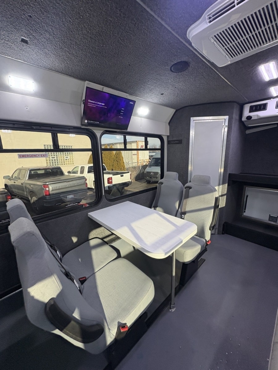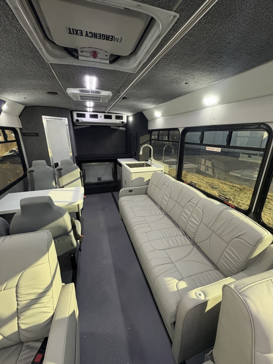 HUUUGE shout out to Divided Find Ranch and Lodge Home to Helicopter Pig Hunting out of San Angelo Texas for purchasing our 2017 F650 and hiring us for an awesome conversion. This unique build feathers a new Onan gas generator and fuel holding tank, a Xantrex power inverter / charger, auxiliary batteries, fuse panel, new 12V system, two rooftop A/C – heaters, plugs throughout, awning, new rear door, storage shelving, sink with countertop and mini fridge, bathroom, kitchen table with seats around it, 2 TV’s, couch with storage compartment and folds into a bed, 2 captain chairs, and 3 swivel chairs.