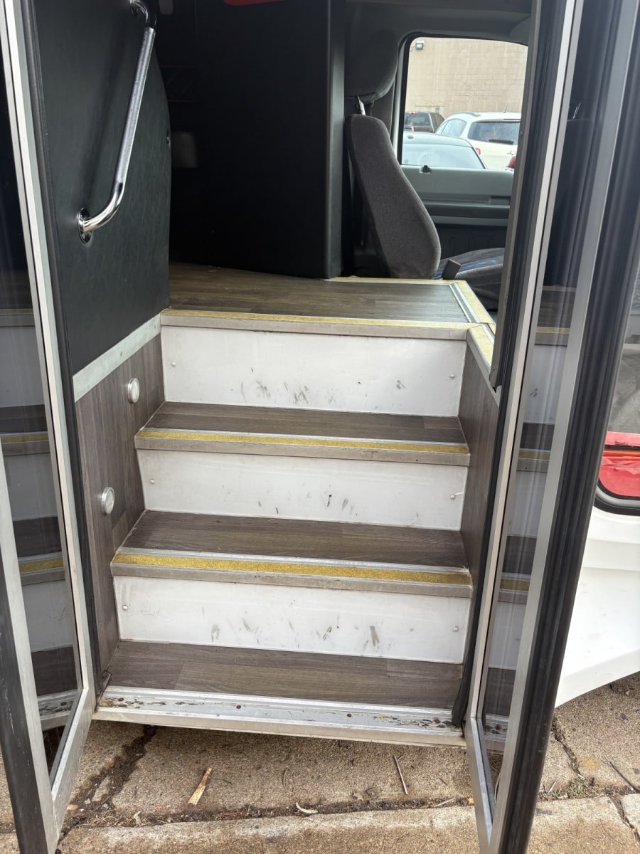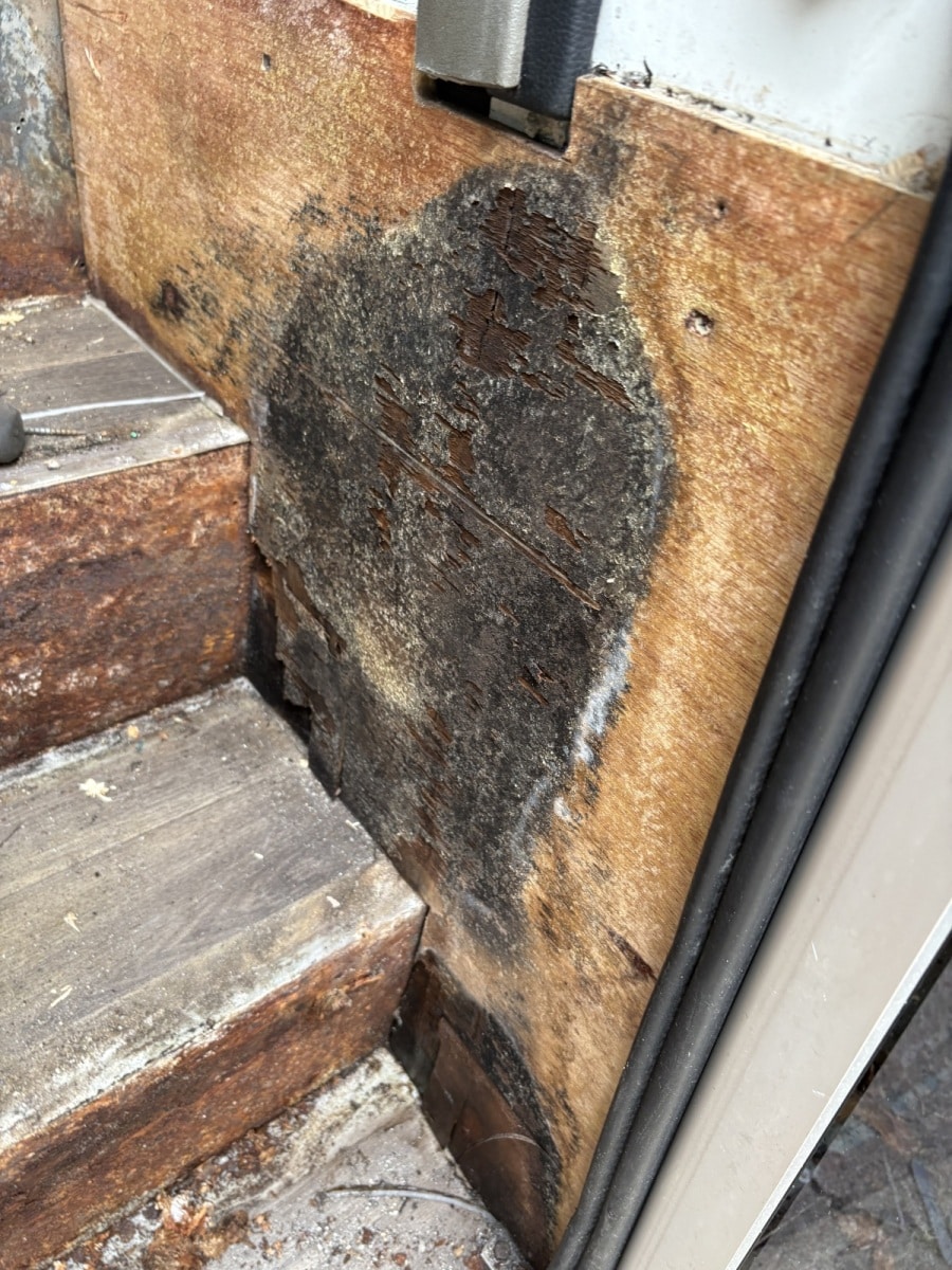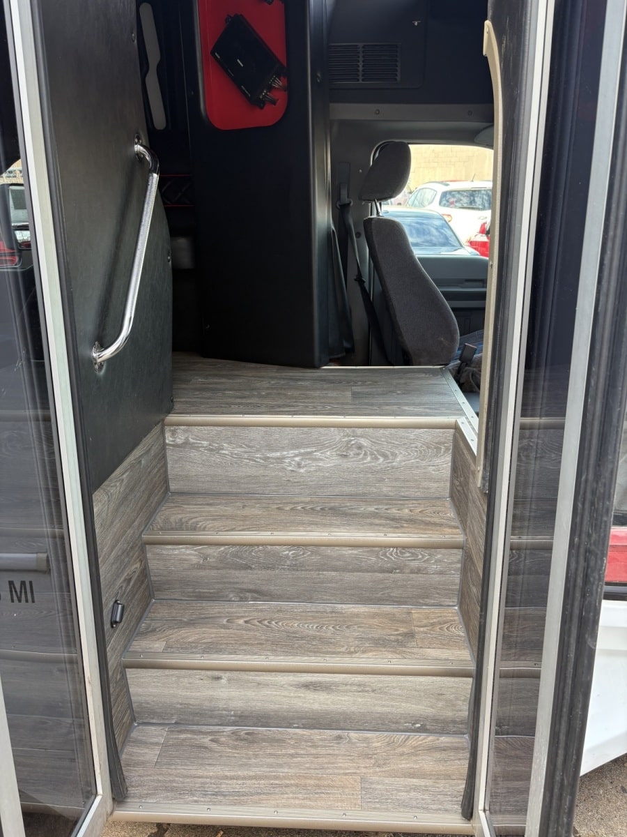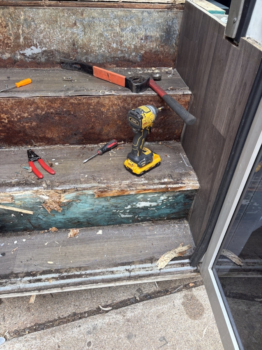 This bus came in for a floor repair and replacement. We did not build this interior. The floor wood was completely rotten. All this damage was caused by leaking drains from the ice chest in the bars. If caught sooner this repair could of been avoided. We also had to replace all the vinyl and wood on the steps. Wood on the steps is always a bad idea because the bottom step always has rain water and the wood just soaks it up! Call today for your free quote. 586-212-5400
