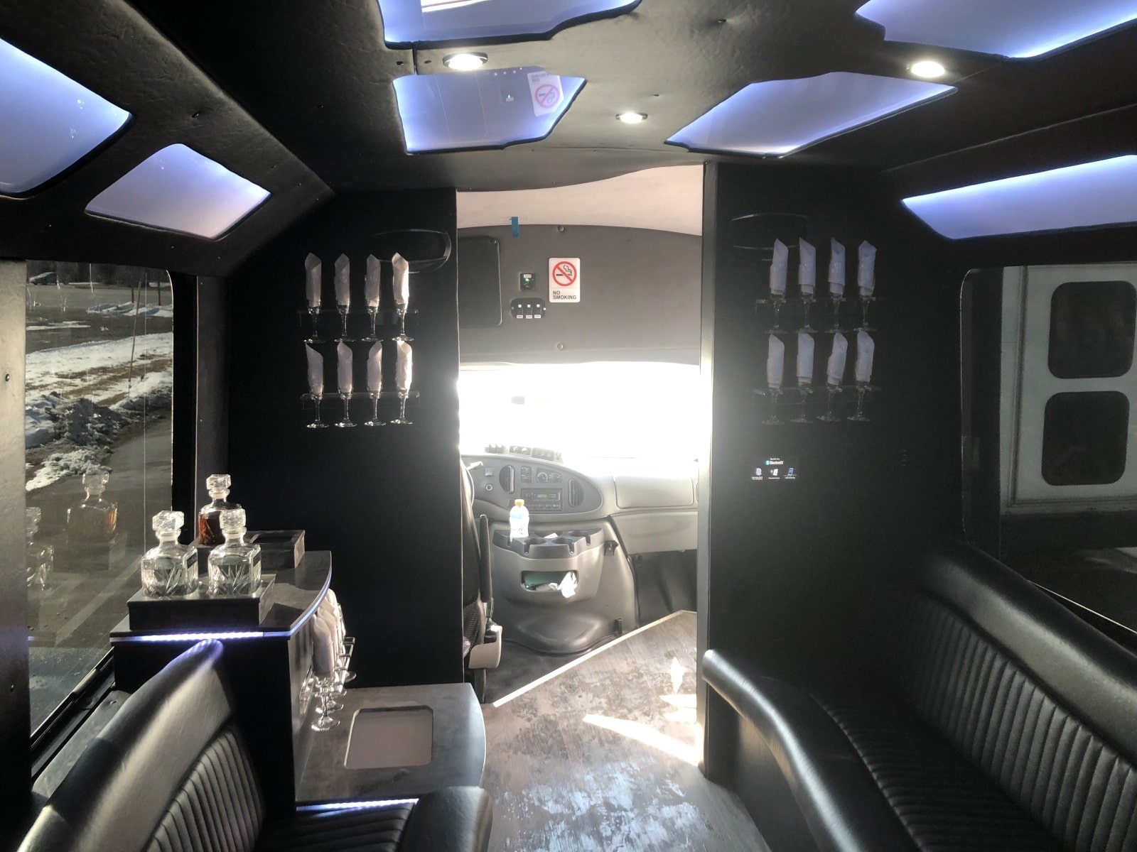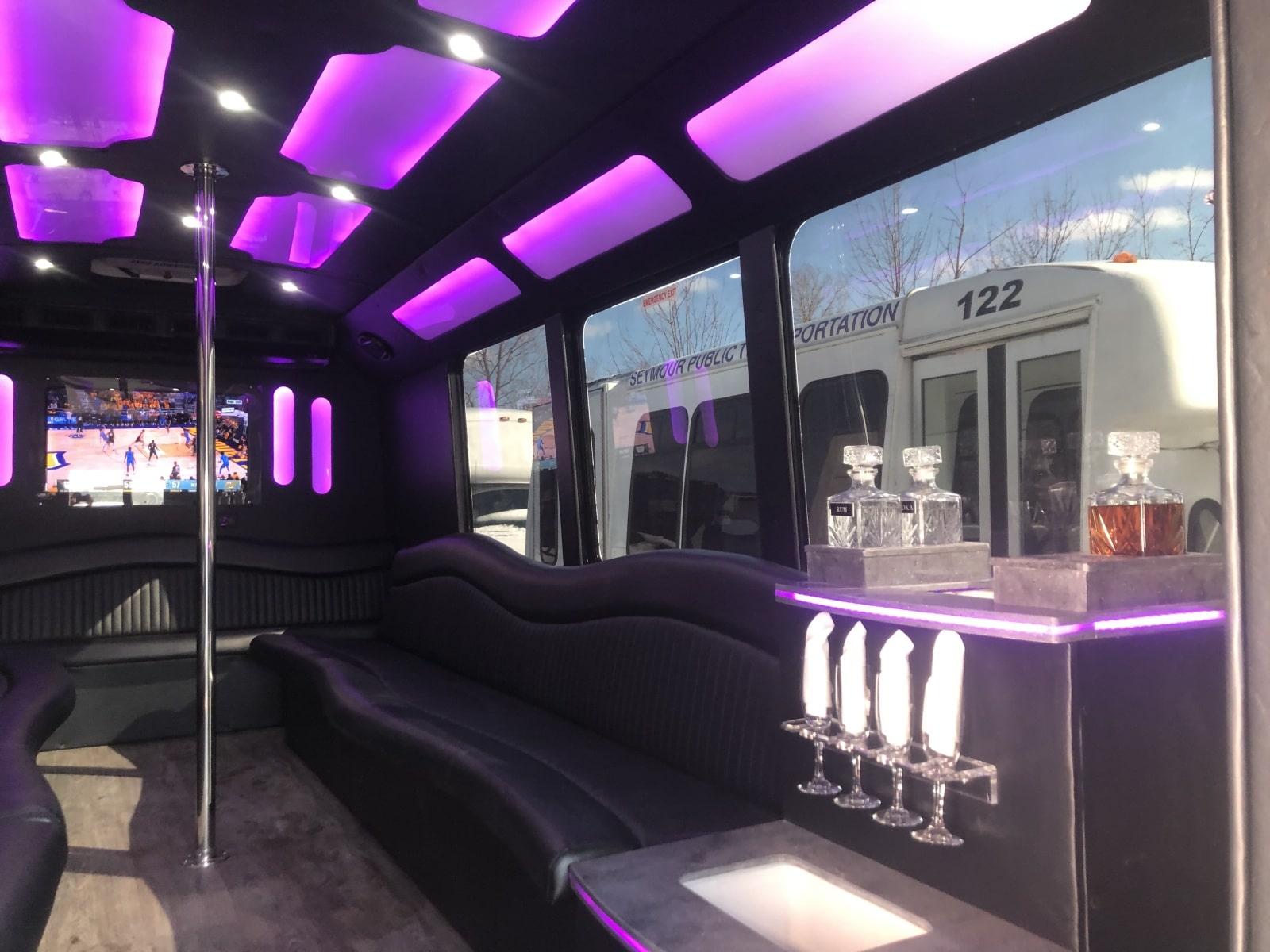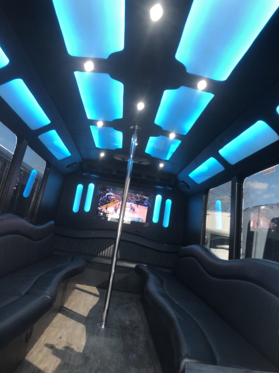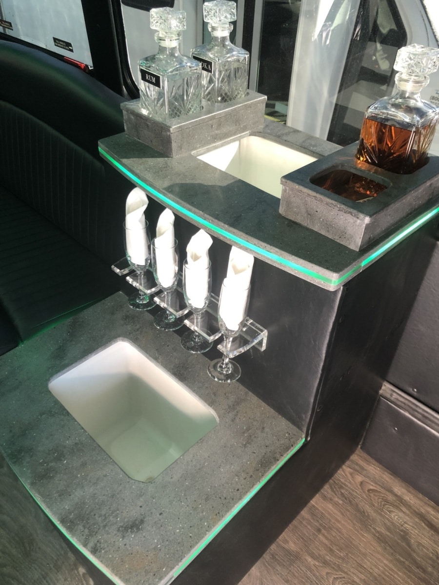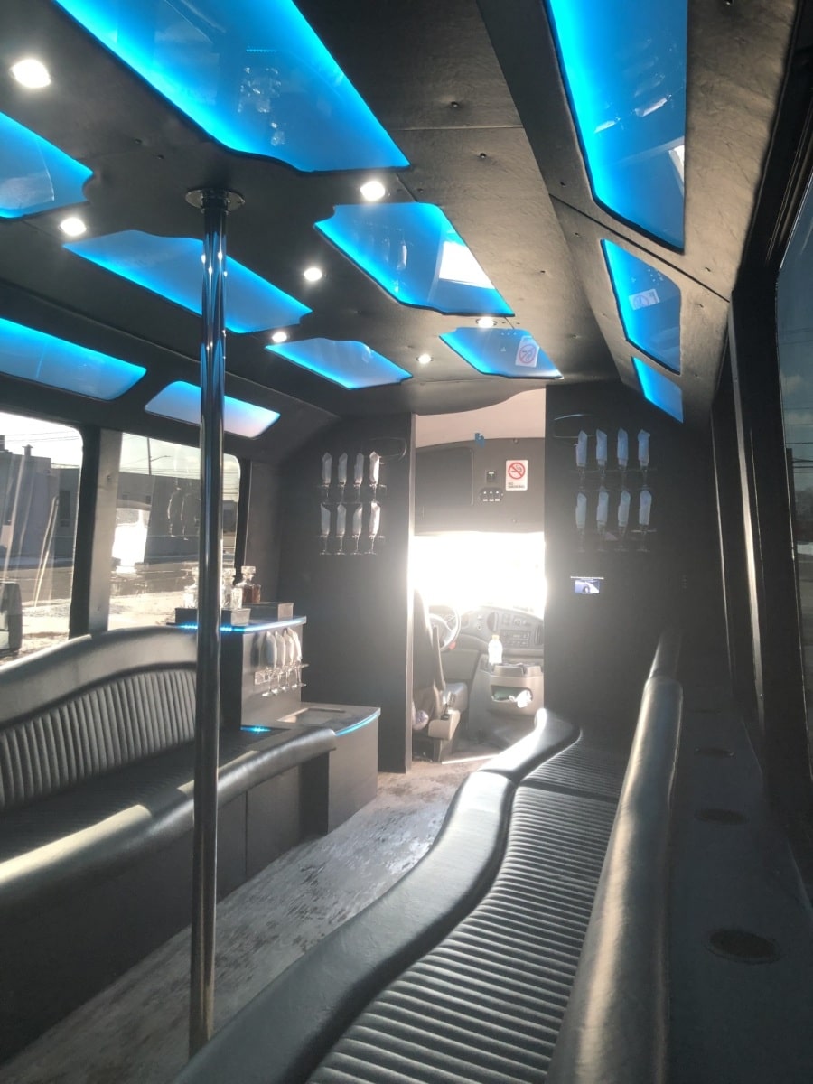 Just wrapped up a party bus for B and M Limo out of Pennsylvania. The build featured Corian countertops on the bar with built in coolers that drained outside the bus. The bus also featured a premium sound system with a touchscreen bluetooth radio. Other features included a dance pole, party lights, wavey seats, one piece roll down floor, smart TV, and new window tint. Reach out today for a free quote!